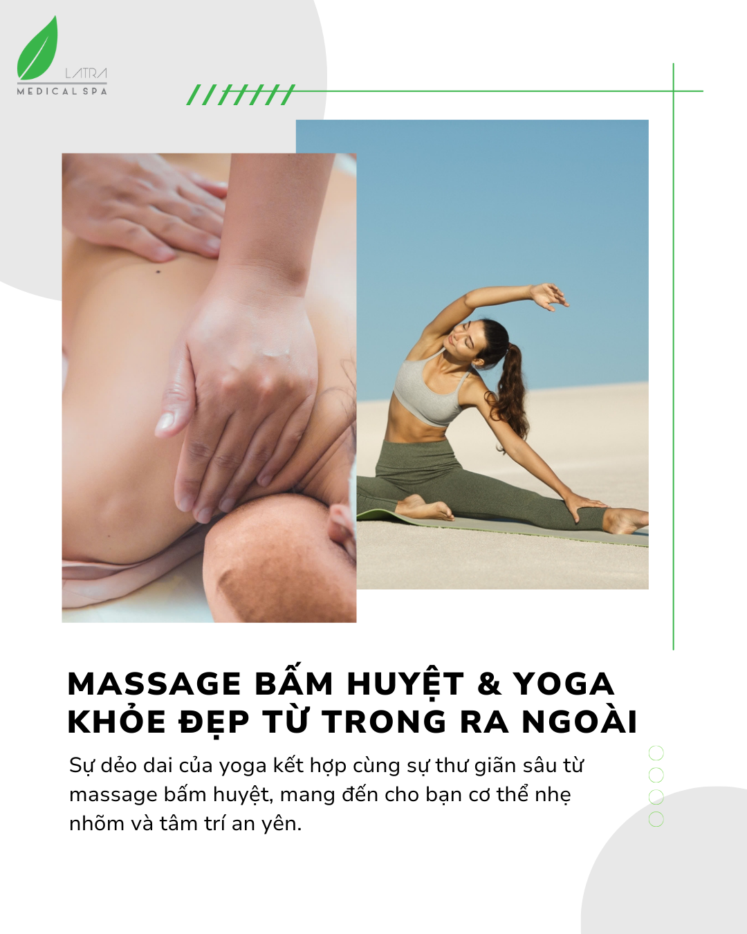 Bạn không cần phải là người tập yoga mới có được cơ thể cân bằng và khỏe mạnh. Chỉ với massage bấm huyệt tại Lá Trà Medical Spa, bạn đã có thể cảm nhận sự thư giãn, phục hồi và một tinh thần tươi mới – khỏe từ trong ra ngoài.